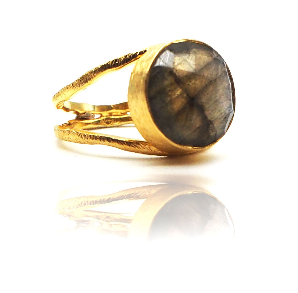 Anillo hecho en plata 925 y bañado en oro con labradorita.