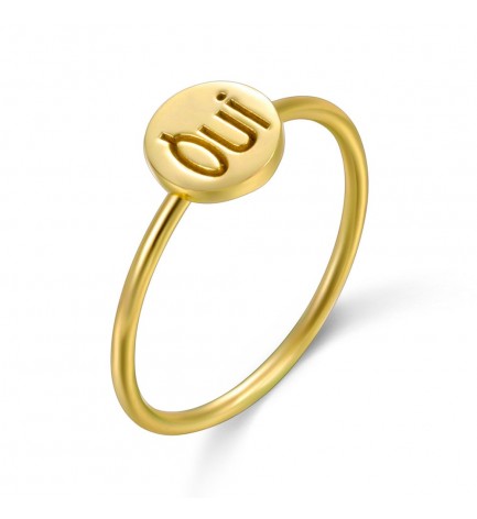 Anillo hecho en plata 925 y bañado en oro con motivo centras circular con la palabra ÒUI grabada.