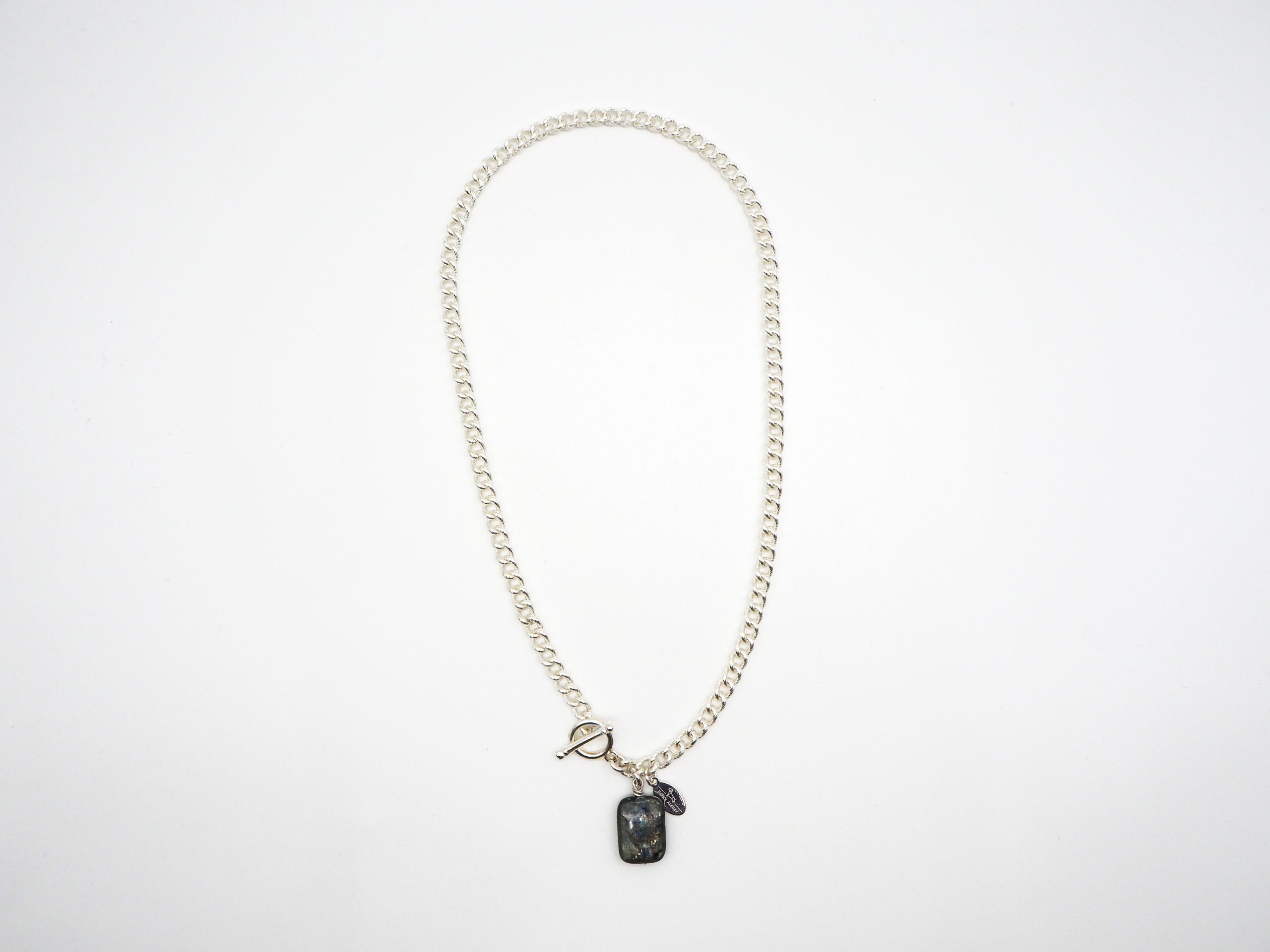 Collar con cadena de latón bañado en plata con cierre marinero acompañado de cristal verde.